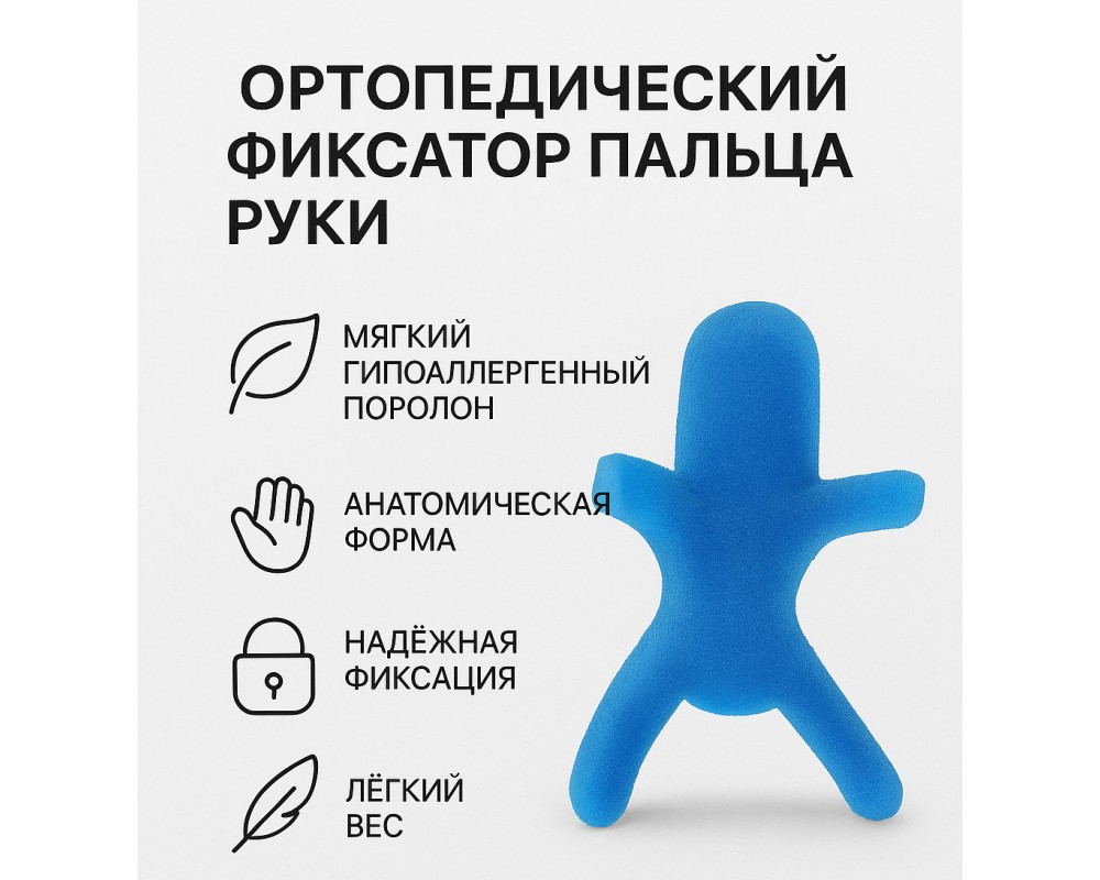 Фиксатор пальца руки из мягкого гипоаллергенного поролона предназначен для надёжной иммобилизации при травмах, растяжениях, вывихах и в послеоперационный период.