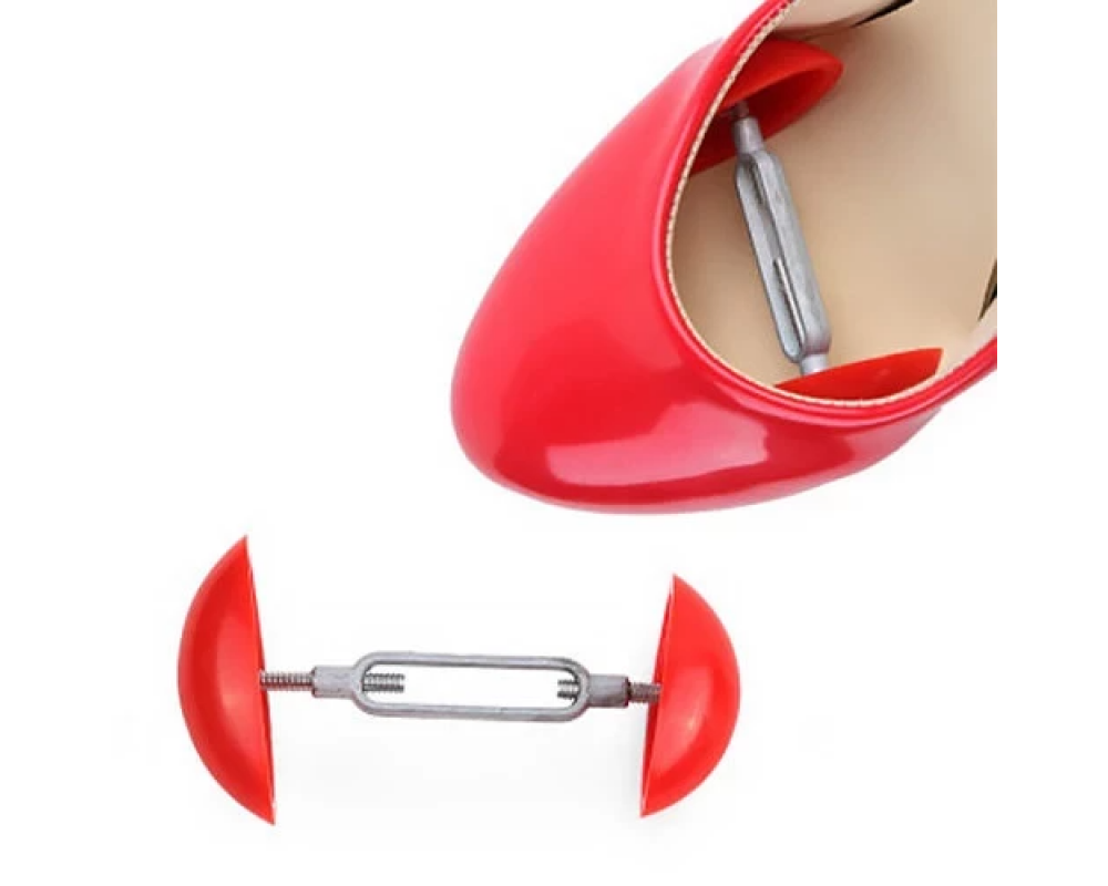 Это компактное приспособление, которое представляет собой металлическую распорку с двумя пластиковыми шляпками. Распорка-расширитель вставляет на ширину обуви или немного под углом, растягивая ее. Пластиковые шляпки создают опору, не давая растяжителю соскальзывать, и одновременно защищают материал от повреждения.
