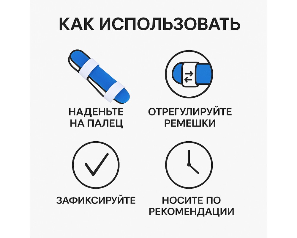 Регулируемые ремешки позволяют легко зафиксировать шину на любом пальце руки, обеспечивая правильное положение и поддержку.